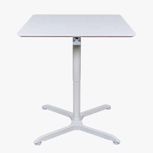 Perfect for offices, restaurants, cafeterias, schools, trade shows, and other venues. Pneumatic air cylinder provides effortless height adjustment in seconds. 32” square white tabletop with contoured edges.