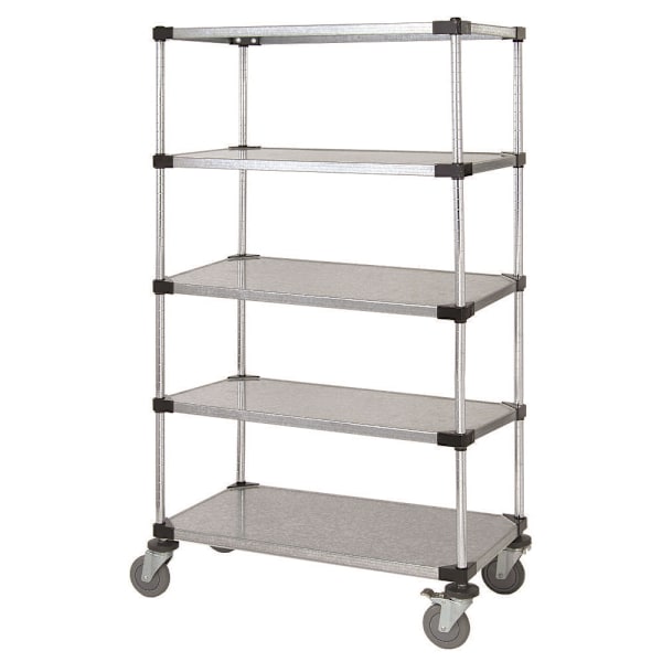 Includes: (5) Solid Galvanized Steel Shelves, (4) 74"H Posts, (4) Donut bumpers, and (4) 5" casters (2 with brakes)