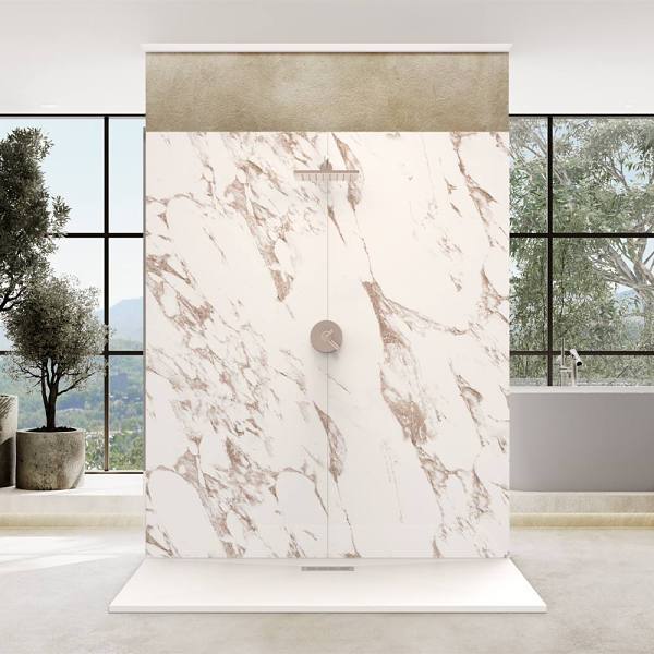 Castico 72x42x84" Solid Composite Stone Alcove Shower Kit Caramel Walls