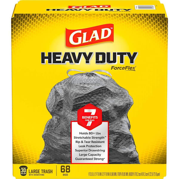 HEAVY DUTY TRASH BAGS: Sixty eight (68) Glad ForceFlex Heavy Duty Large Trash Bags that can handle the toughest jobs indoors and outdoors; package may vary