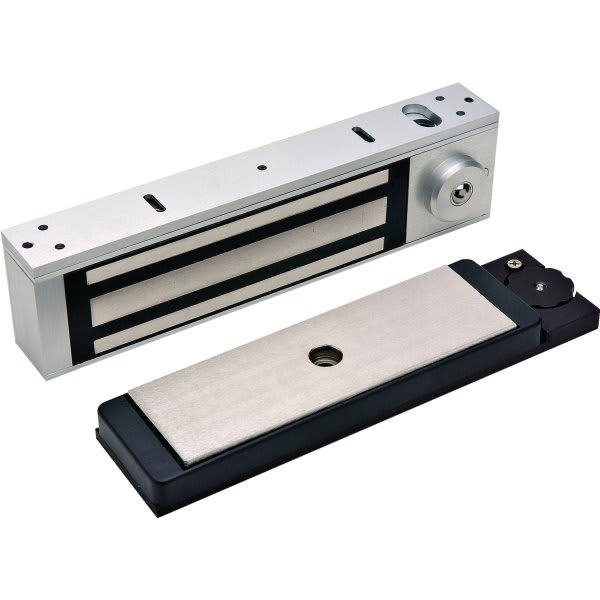 Electromagnetic lock, surface mounted for outswing doors. includes early warning door movement sensor output and door status output. designed to initiate a remote alarm upon unauthorized exit attempts or to trigger an off-site delay egress system.
