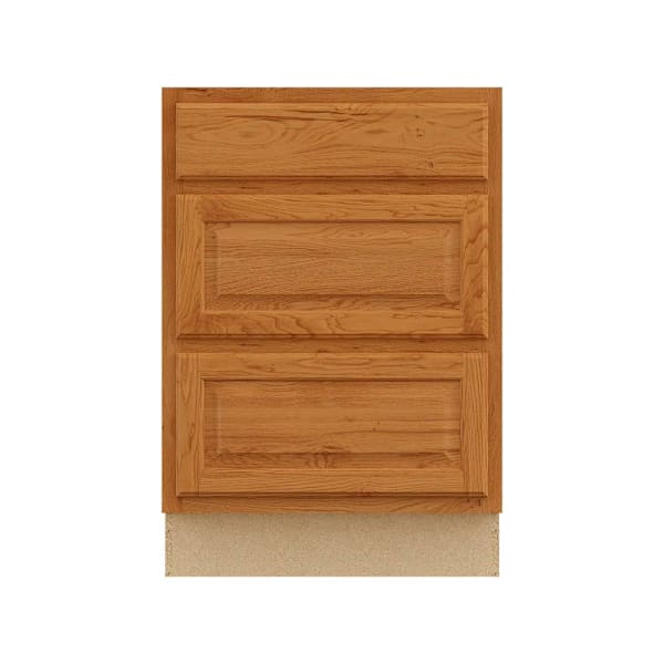 Hampton Bay 24in. W x 34.5in. H x 24in. D Hampton Raised Panel Drawer Base Cabinet with 3 Drawers, Medium Oak