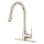 Elegant forward handle design underscores ergonomic function and helps where space behind the faucet is limited