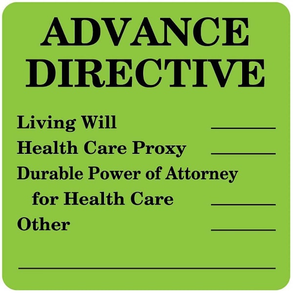 Advanced directive label clearly communicates and documents wishes regarding health care.