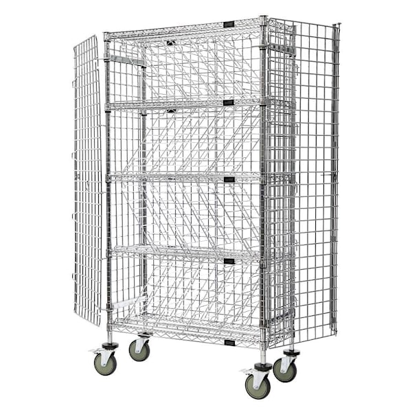 (5) wire shelves, (4) posts, (12) slanted dividers, (2) wall mount braces, (4) foot plates, (1) security panel set and (1) security door set