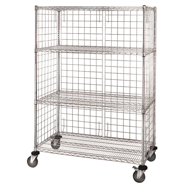 Includes: (5) Wire shelves, (4) Enclosure panels, (4) 63"H Posts, (4) Donut bumpers, and (4) 5" Casters