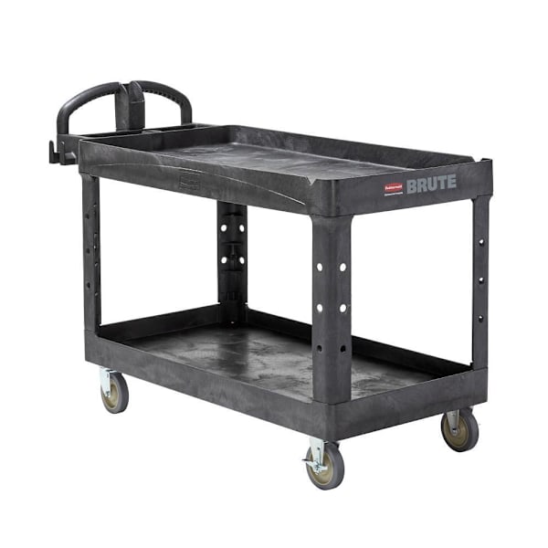 • Rubbermaid Commercial FG454600 black large two-lipped shelf Utility Cart. This utility cart is made of sturdy structural foam for long-lasting durability, and its two lipped shelves can hold a wide variety of items while helping to prevent spills. The molded-in storage compartments, holsters, hooks, and notches make it easy to load this cart to the brim with supplies, and its ergonomic handle makes it easy to maneuver. The rounded corners help protect walls and furniture from scratches and bumps, and thanks to its 4" casters, this cart is conveniently mobile.