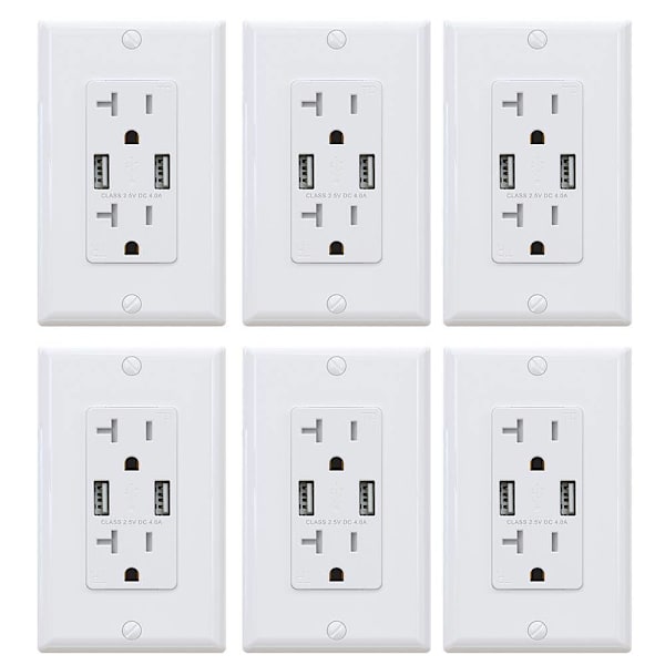In-wall duplex receptacles with two USB charging outlets with a total output of 4.0 Amp (2.0A standalone), 5V DC.