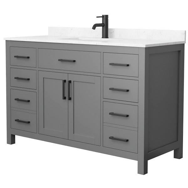 Concealed soft-close door hinges. Carrara Cultured Marble countertop includes 3" backsplash and reversible sidesplash