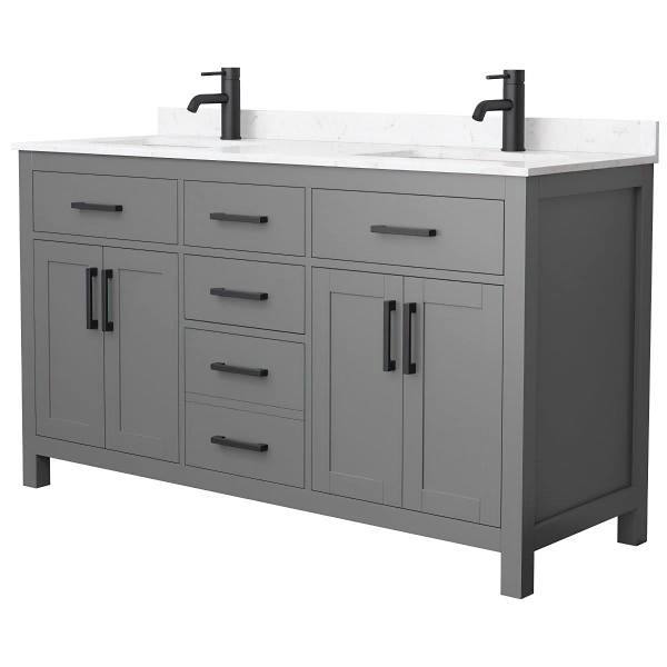 Concealed soft-close door hinges. Carrara Cultured Marble countertop includes 3" backsplash and reversible sidesplash
